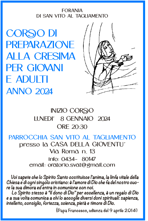 E’ in aumento il numero di giovani e adulti che hanno ricevuto il battesimo nell’infanzia e chiedono di completare il cammino di iniziazione cristiana ricevendo il sacramento della Cresima. Questa crescente richiesta è una provvidenziale opportunità pastorale per la nostra Chiesa perché determinata non solo dalla necessità della Cresima in vista del matrimonio o dell’impegno a fungere da padrini, ma anche dal desiderio di riprendere un cammino di fede più convinto e personale.