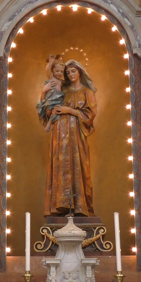 L’opera di Castions, particolarmente piacevole per la dolcezza dell’intaglio conferita dall’artista e per la pregevole cromia, probabilmente ebbe a sostituire una vetusta pala effigiante la Madonna del Rosario circondata dai Misteri, opera eseguita dal pittore Gasparo Narvesa agli inizi del Seicento per la chiesetta della Madonna del Rosario (o del Ponte), edificio non più esistente. Ciò che rimane dell’antica tela, alcuni Misteri e parte di un angioletto, è ora conservato nella nostra Raccolta d’Arte Sacra.