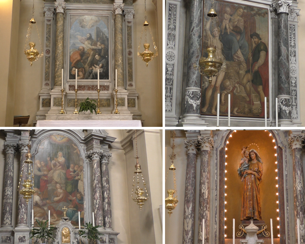 eretta a difesa della prima comunità cristiana del nostro paese che si può ipotizzare insediata nei secoli VI/VII. All’interno della chiesa, dalla quale si accede da un portale in pietra datato 1656, sono collocati quattro altari laterali. Entrando a sinistra, il primo include una seicentesca pala di Antonio Carneo raffigurante la Santissima Trinità, San Giovanni Battista, San Bartolomeo, Sant’Antonio di Padova col Bambino e un offerente, nel secondo è collocata la Discesa dello Spirito Santo di Pomponio Amalteo (1532).