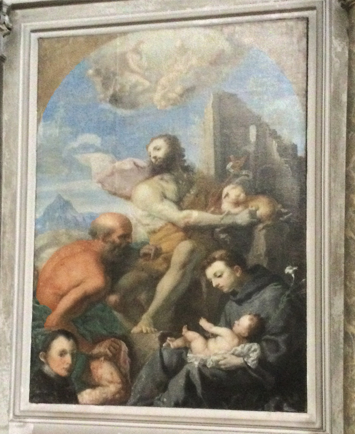 Il dipinto, plausibilmente eseguito tra il 1680 e il 1685), alcuni anni orsono è stato interessato da un provvidenziale restauro che l’ha riportato all’originaria bellezza e alla corretta lettura iconografica. Nel corso dei secoli, difatti, alcuni personaggi della composizione erano stati travisati, il San Bartolomeo trasformato in San Gerolamo con la copertura della pelle scuoiata e il diverso colore conferito alla veste. Del committente (identificato da alcuni studiosi col vicario Giovanni Antonio Furlanis, ma verosimilmente si tratta dell’allora parroco Angelo Marcolini come, peraltro, attestato dalla memoria popolare), erano stati alterati i tratti fisionomici. Scomparso, inoltre, era lo svolazzante mantello del Battista e nascosta anche l’immagine della Santissima Trinità. Ora la figurazione trinitaria è tornata a stagliarsi nell’azzurrino cielo dipinto dal pittore friulano, col Padre, il Figlio e lo Spirito Santo attorniati da un vaporoso stuolo di angioletti. Peraltro, sono curiosi alcuni dettagli attinenti il dipinto, particolari che confermano l’attenzione posta dal Carneo ai modelli a stampa. Il San Giovanni Battista è chiaramente dipendente dal Giona affrescato da Michelangelo per la Sistina e trasposto alla metà del Cinquecento da un valido seppur anonimo incisore italiano. Medesima è la postura evidenziata nella torsione del busto con identico piegamento del braccio destro e analoga risulta, nel confronto, la posizione delle gambe. La gamba sinistra alzata, verosimile motivo della resurrezione cristologica – informati che si tratta del Precursore – è peraltro posa ricorrente in molte delle figure messe in opera dal Carneo. La tela castionese appare, dunque, quale sorta di puzzle di rimandi e citazioni se si tiene conto, oltre quanto evidenziato, che il brano del Sant’Antonio di Padova col Bambino è fedelmente riproposto in un’altra tela del Carneo (Venezia, Ca’ Rezzonico) e il San Bartolomeoè chiaramente ripreso dal San Girolamo di Jacopo Bassano presente in una pala del maestro veneto ora custodita nel Museo Civico di Treviso. Dipinto, forse ammirato de visu dal Carneo, autore che nella nostra parrocchiale ha licenziato una delle maggiori opere tra quelle espresse dalla cultura figurativa del Seicento nel Friuli concordiese.