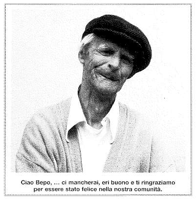 Anche il Bepo ci ha lasciato. Ci mancheranno i suoi giri per il paese, le sue meditazioni sul ponte, i suoi saluti nelle feste, lo scambio di pace alla Messa delle nove. Povero in canna, eppure uno di noi, forse per questo uno di noi. Un giorno, assieme a Gianfranco, viene con me a Sappada, dove ero salito per celebrare la Messa per un gruppo di parrocchiani in gita sulla neve. Dico a lui e a Gianfranco: “Fermatevi qui, in questo bar, fino a quando ho terminato”.